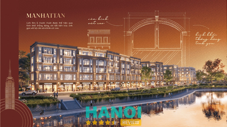 Kiến trúc Manhattan tại đây được thể hiện qua những đường nét mạnh mẽ, sắc sảo với cửa kính lớn, ban công rộng rãi và hệ thống chiếu sáng hiện đại. Diện tích từ 75-138m2, mật độ xây dựng 80%, mặt tiền 5-7,8m tạo nên không gian lý tưởng cho các mô hình kinh doanh sáng tạo, thời trang hay F&B cao cấp.