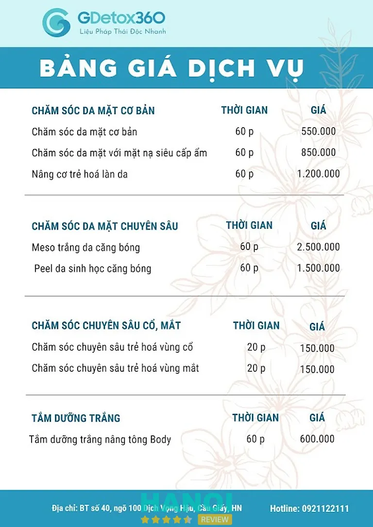 GDetox360 Spa được nhiều kênh review spa ở Hà Nội đánh giá cao — cho thấy độ tin cậy về dịch vụ, chất lượng, và phản hồi tích cực từ khách hàng.